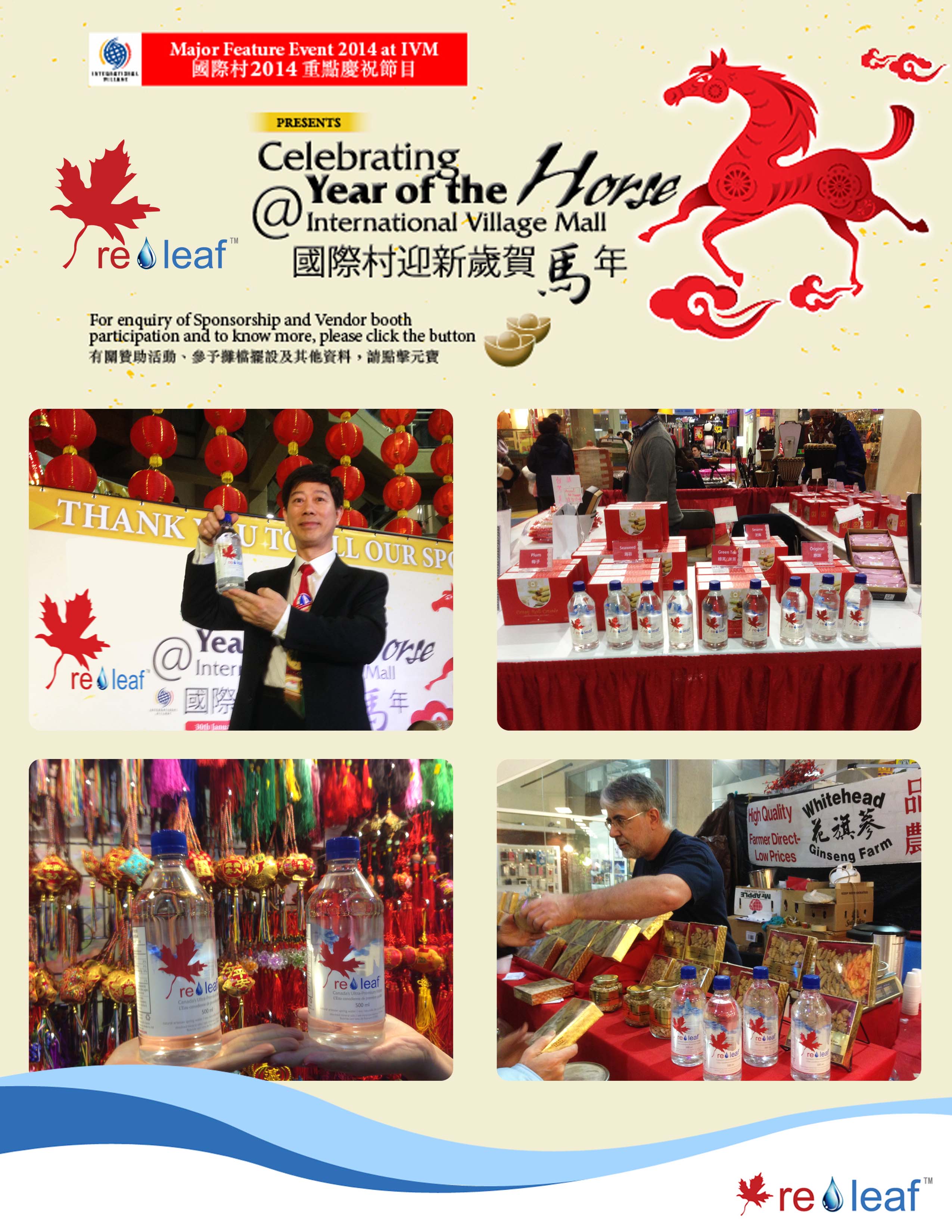 温哥华矿泉水(加拿大)企业有限公司成为国际村迎新岁贺马年赞助商。"国际村迎新岁贺马年"最吸引人的就是丰富的年宵摊档和富有年味的商品。从象征吉祥如意的盆栽、挂饰、年画,到各类用家居用品、电子产品,衣帽鞋袜,年货美食,应有尽有。歌舞、武术、魔术、抽奖等精彩节目也不间断登场。Releaf 饮用水成为本次活动唯一饮用水赞助商,祝新老客户在马年身体健康、万事如意。