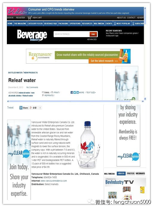 在2013年17届美国迈阿密食品与饮料展销会上,美国工业饮料杂志独具慧眼的推荐了温哥华矿泉水(加拿大)企业有限公司的