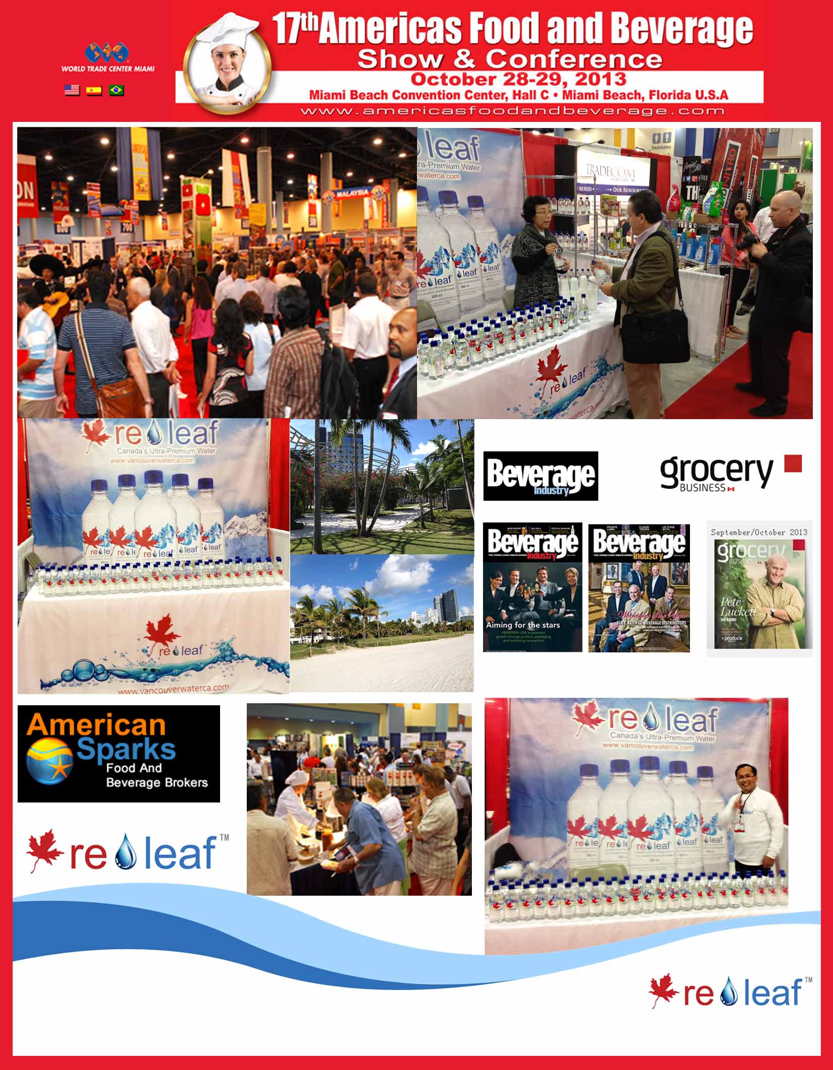Vancouver Water Enterprises joined in the 17th Americas Food and Beverage Show in Miami on Oct 27 and 28 as a high quality water producer .the attractive booth design and great tasting releaf water all invited people to flock around it .this was the first time we introduced our ultra-premium Canadian Water to Miami. Many Companies have direct intentions to deal with us ,Such as American Sparks and USA EMBASSY. Beverage Industry and Grocery Business Magazine will promote releaf water in their new issue .Releaf ultra-premium water will bring not only high quality but also great taste to people all over the world .